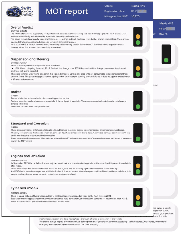 Swifty helps you spot those patterns early by looking at the whole MOT history for clues on problems areas and cars that have potentially have had a poor maintenance history — before you invest your time, your money, or your excitement.
